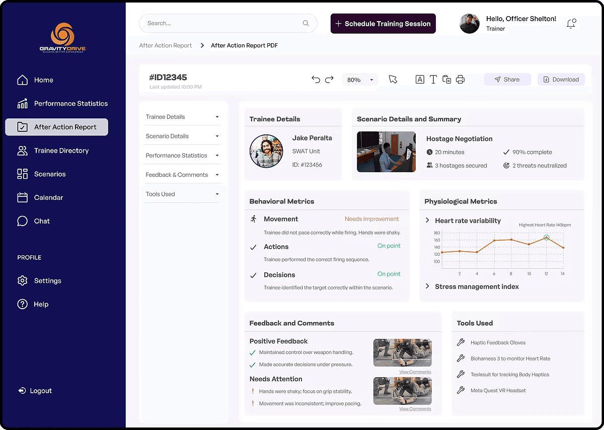 The GravityDrive After-Action Report module redefined feedback mechanisms with customizable templates, detailed trainee insights, and scenario-based effectiveness metrics. John can now tailor reports, view performance trends visually, and provide actionable feedback effortlessly, ensuring every session's data is maximized for growth.