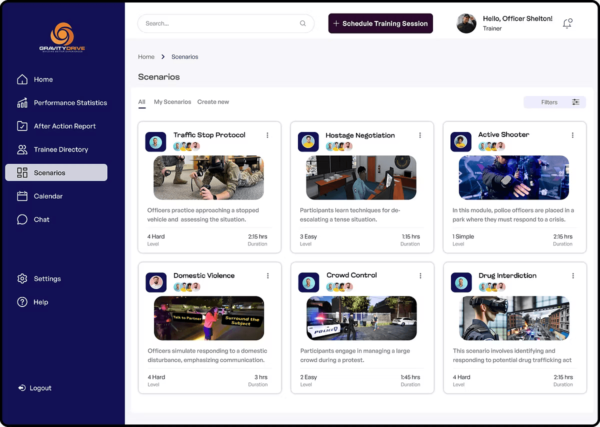 Tyler spends their days helping officers sharpen their skills through VR training. They run realistic scenarios, track each officer’s performance, and provide feedback to ensure everyone is prepared for high-pressure situations in the field. Tyler often felt stuck with limited data and vague insights. It is hard to give officers the feedback they need. That’s where Gravity Drive comes in.